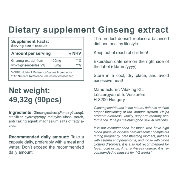 Vsebuje naravne snovi, ki normalizirajo delovanje telesa, krepijo telesno in duševno odpornost. Izvleček ginsenga Vitaking je na voljo v 400 mg.